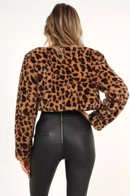 Women’s Leopard Print Cardigan Jacket – Short Hidden Hook Faux Fur Long Sleeve Coat