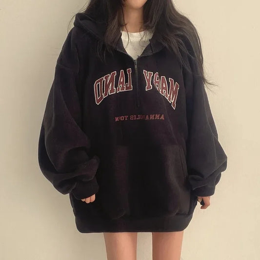 Women's Oversized Fleece Graphic Hoodie with Zipper Detail