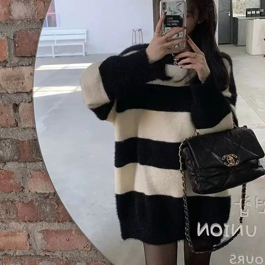 Oversized Sweater Striped Turtleneck Knit Pullover