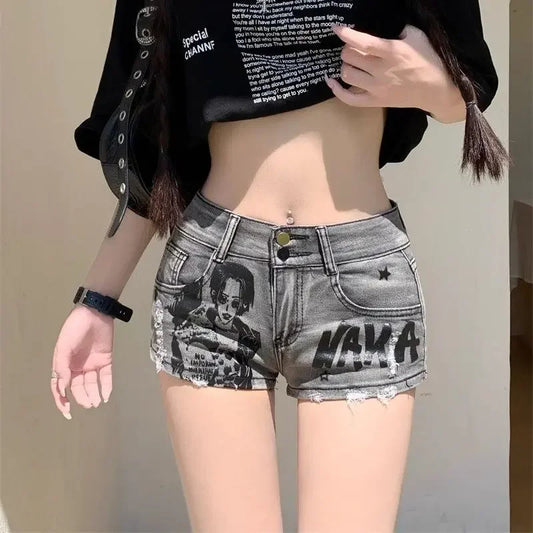 Low-Waist Skull Print Distressed Denim Shorts Women – Edgy Summer Streetwear