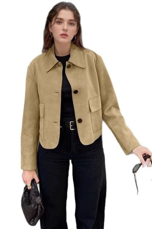 Fashionable Suede Women's Windbreaker Coat – Khaki Casual Trench Jacket with Pockets