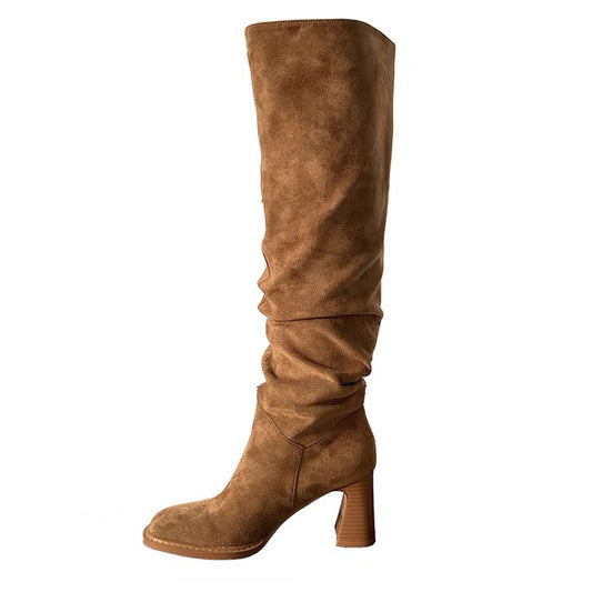 Khaki Suede Boots for Women | Square Toe Chunky Heel All-Season Footwear