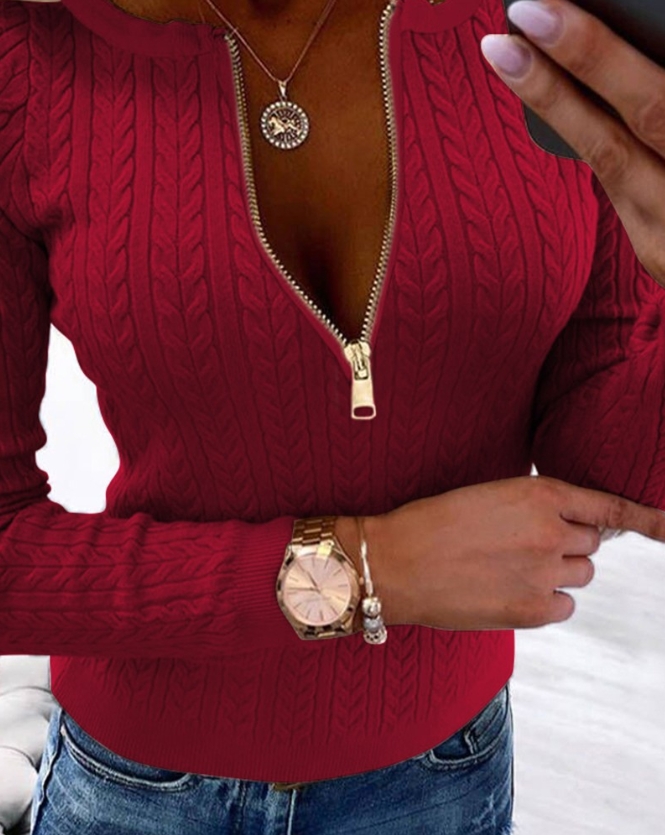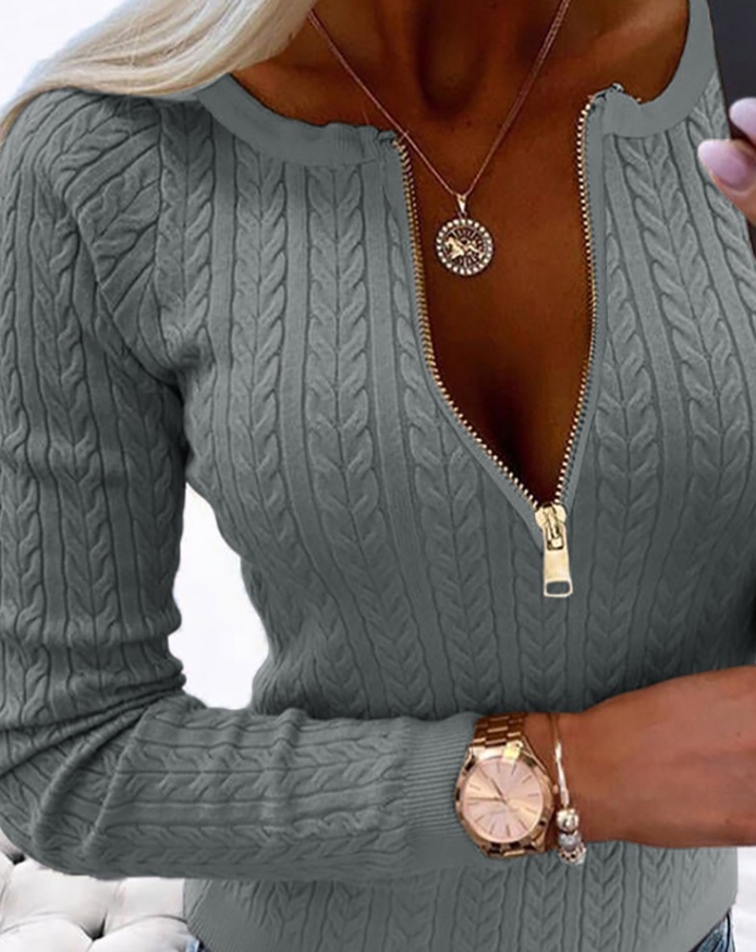 Women's Sweater Round Neck Zipper Design Cable Knit Sweater Temperament Commuting Leisure Retro Elegant Sweater