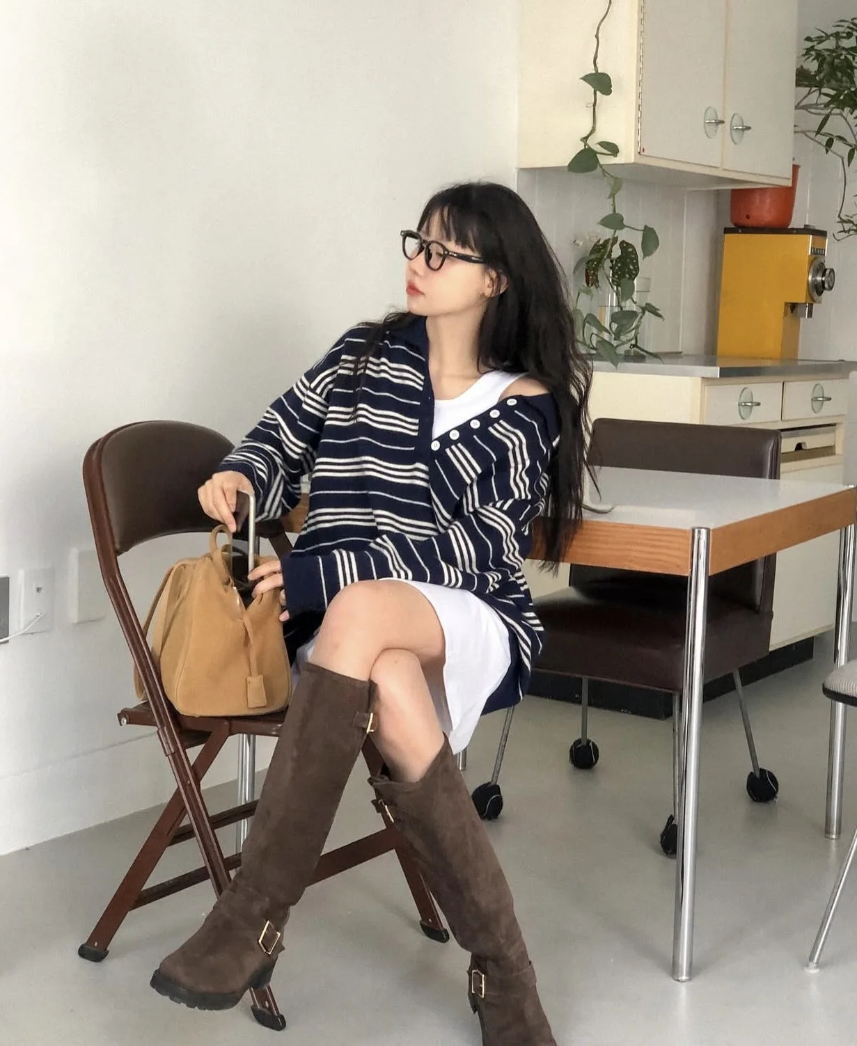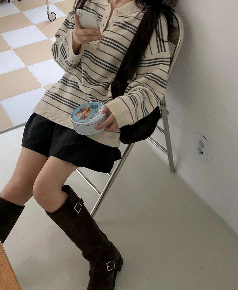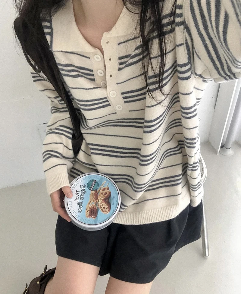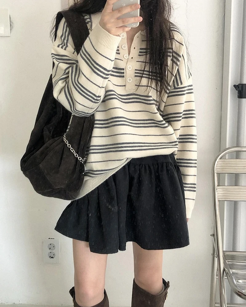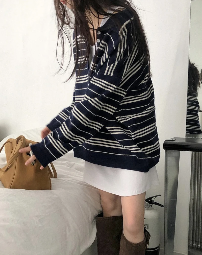 Blue White Striped Oversized Sweater Embroidered Mock Neck Cropped Jumper Harajuku Women S Pullover