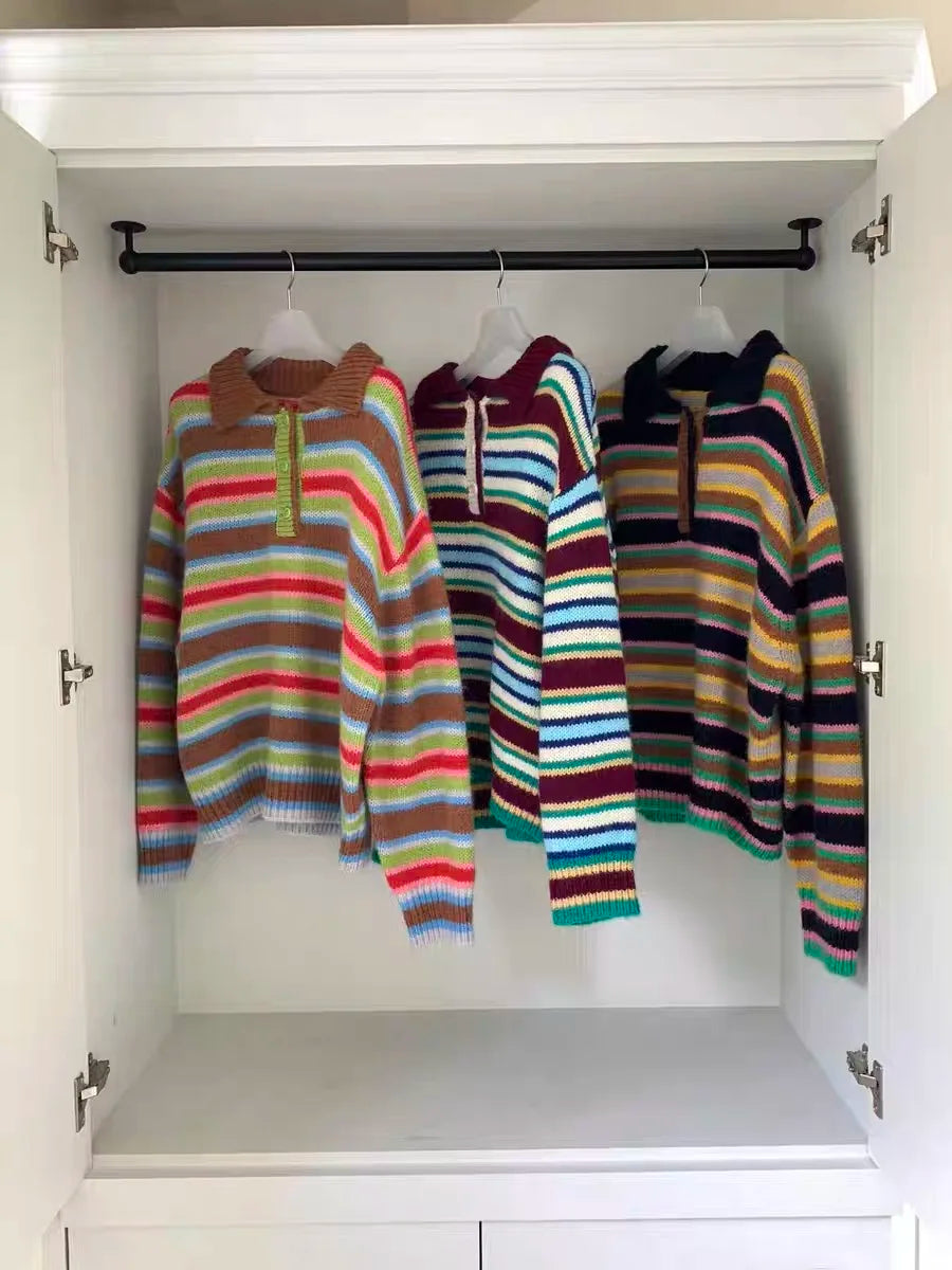 Embrace vintage aesthetics with this expertly crafted contrast stripe sweater, designed for the modern woman seeking timeless style. Featuring a flattering V-neckline with lace-up detailing and a relaxed silhouette, this knit piece delivers both comfort and sophistication. The extra-heavy polyester construction provides durability and warmth through autumn and winter months, while subtle stretch ensures ease of movement. With its turn-down collar and full sleeves, this versatile pullover transitions effortlessly from casual to refined settings. Perfect for layering or wearing solo, it's an investment piece that transcends seasonal trends.