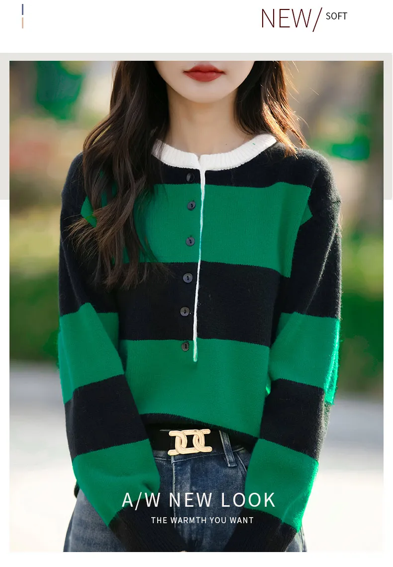 2024 Autumn Winter Womens Striped O Neck Sweater O Neck Long Sleeves Oversized Fit