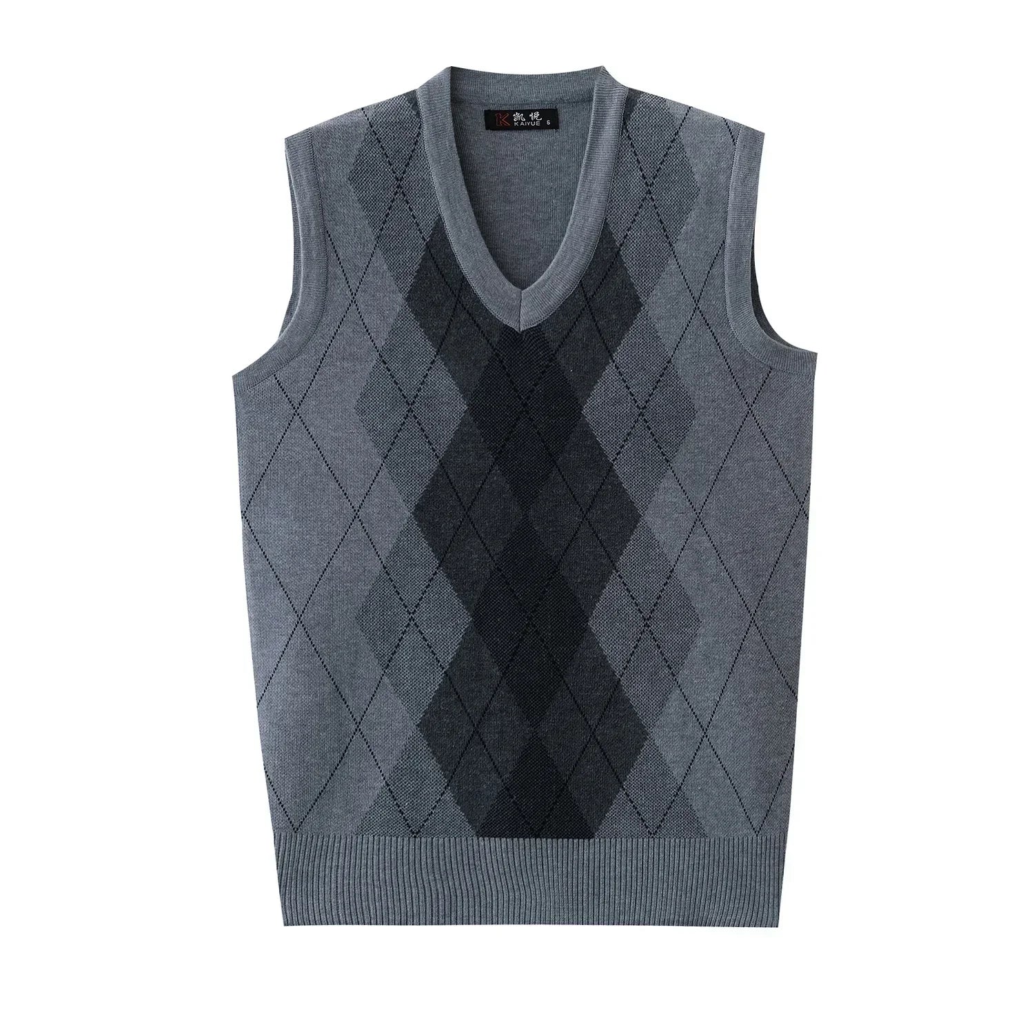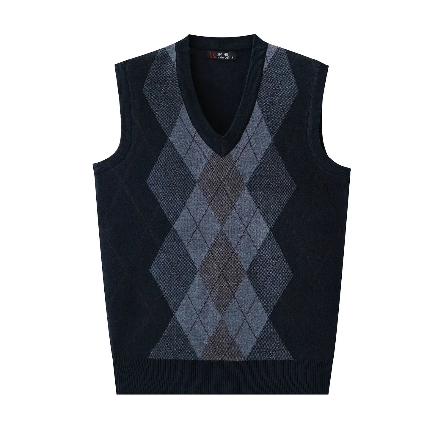 This versatile men's knitted vest combines timeless argyle styling with everyday comfort. Crafted from a premium cotton-polyester blend using computer knit technology, it delivers a refined look perfect for casual autumn and winter wear. The classic crew neckline and sleeveless design layer effortlessly over long-sleeve shirts for added warmth and dimension. Available in sizes L through 2XL with precise measurements provided, this geometric-patterned piece maintains its shape with standard thickness construction. An essential wardrobe staple that transitions seamlessly from weekend outings to relaxed office settings.