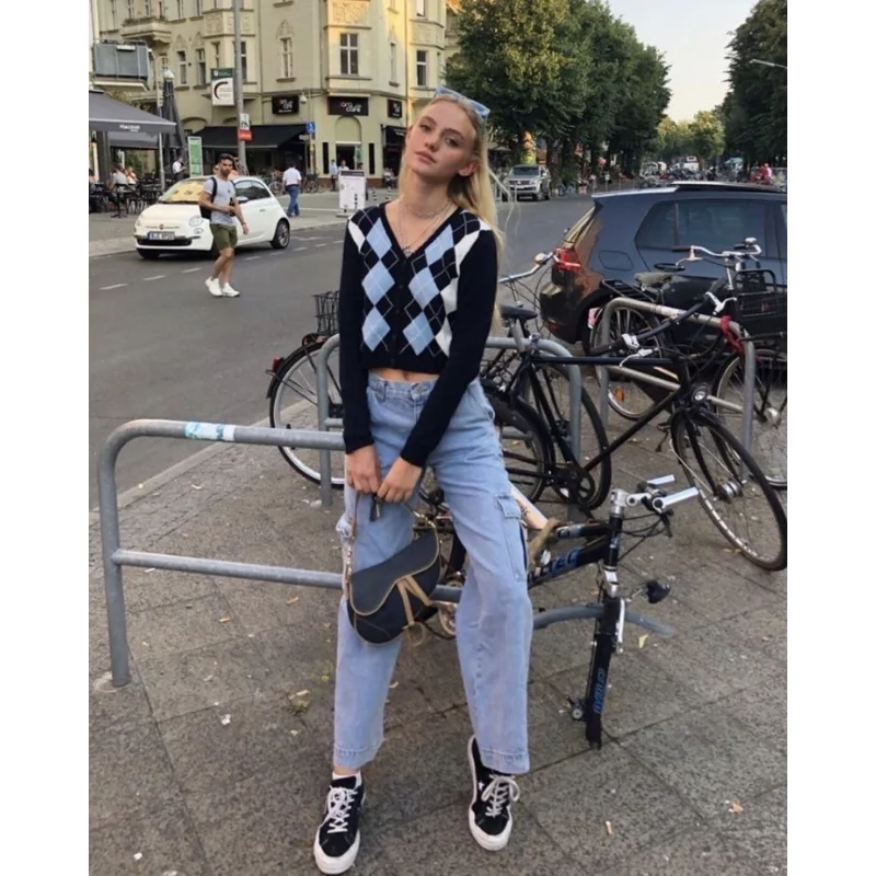Retro Diamond Jacquard Knitted Cardigan V Neck Single Breasted Long Sleeve Short Pullover Sweater For Women