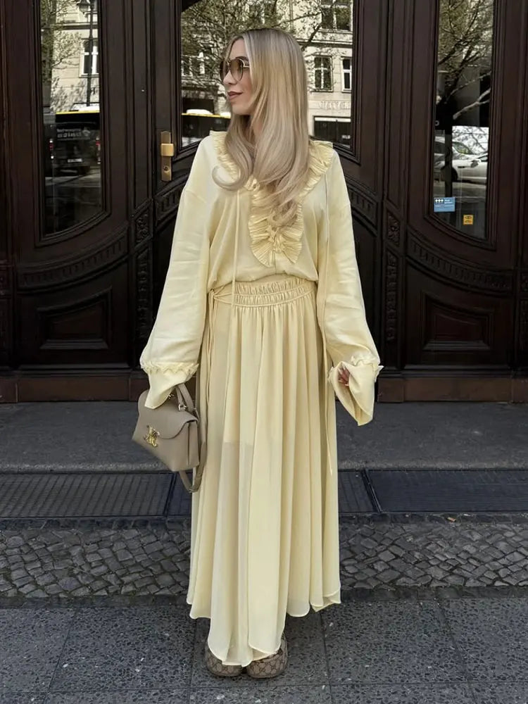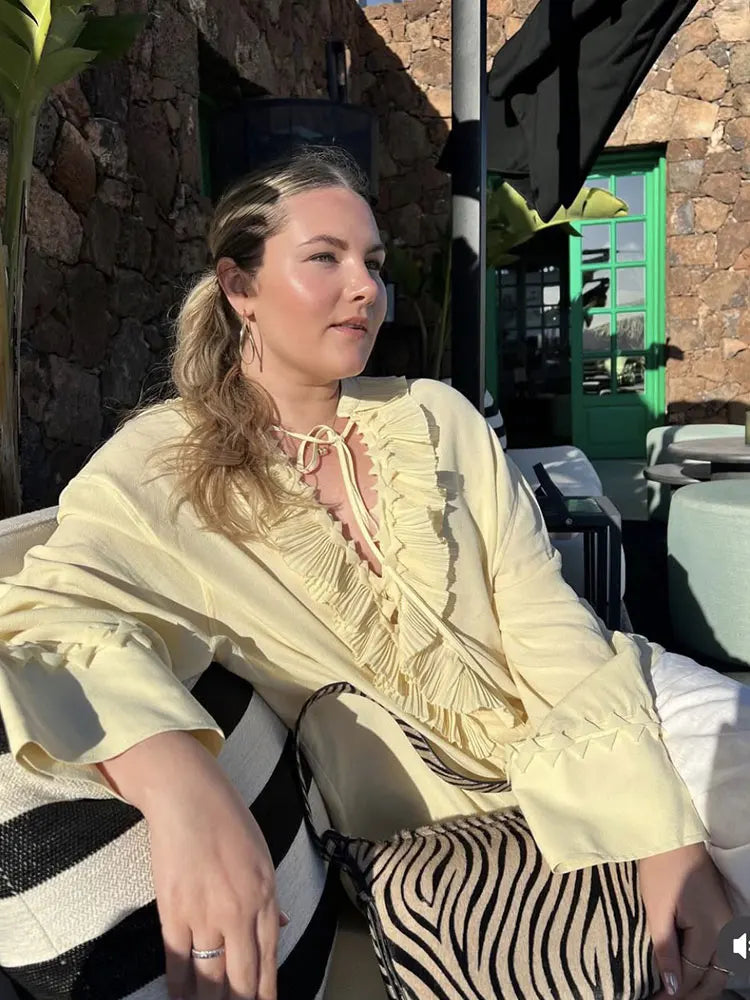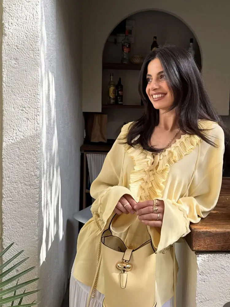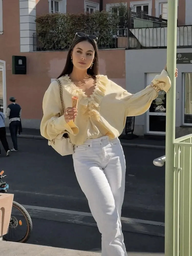 2025 Summer Fashion Vintage Womens Solid Ruffle Blouse Casual Sweet Elegant Top For Youth