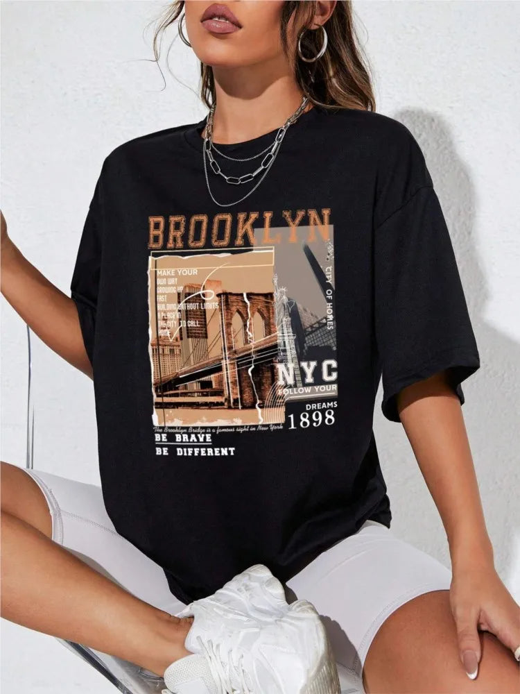 1898 Brooklyn New York Printed Tee – Women’s Casual Cotton Graphic T-Shirt, Summer Street Style Outfit
