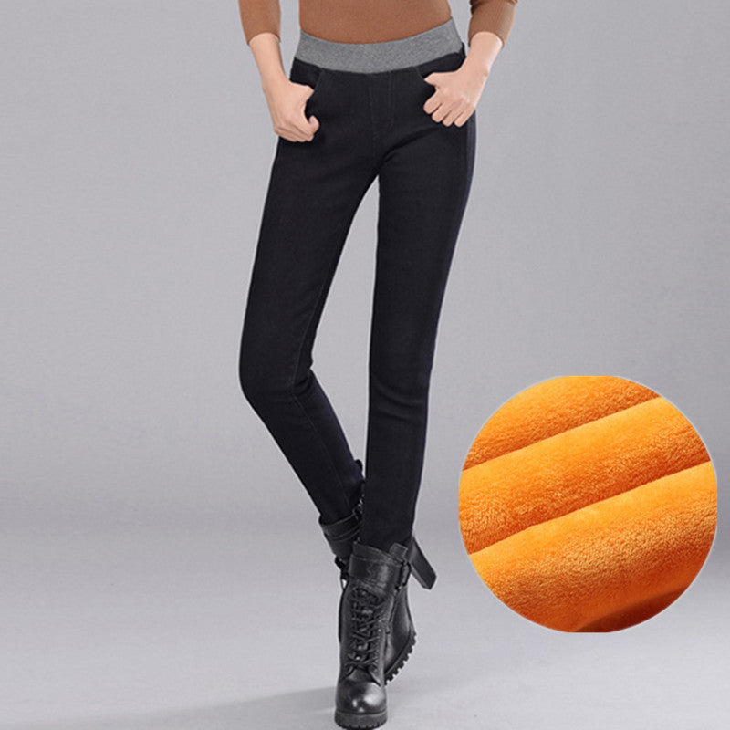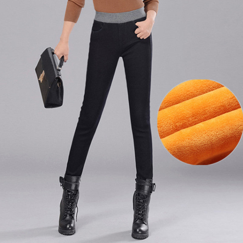Plus-Size Velvet-Lined Pencil Jeans – Warm High-Stretch Winter Pants