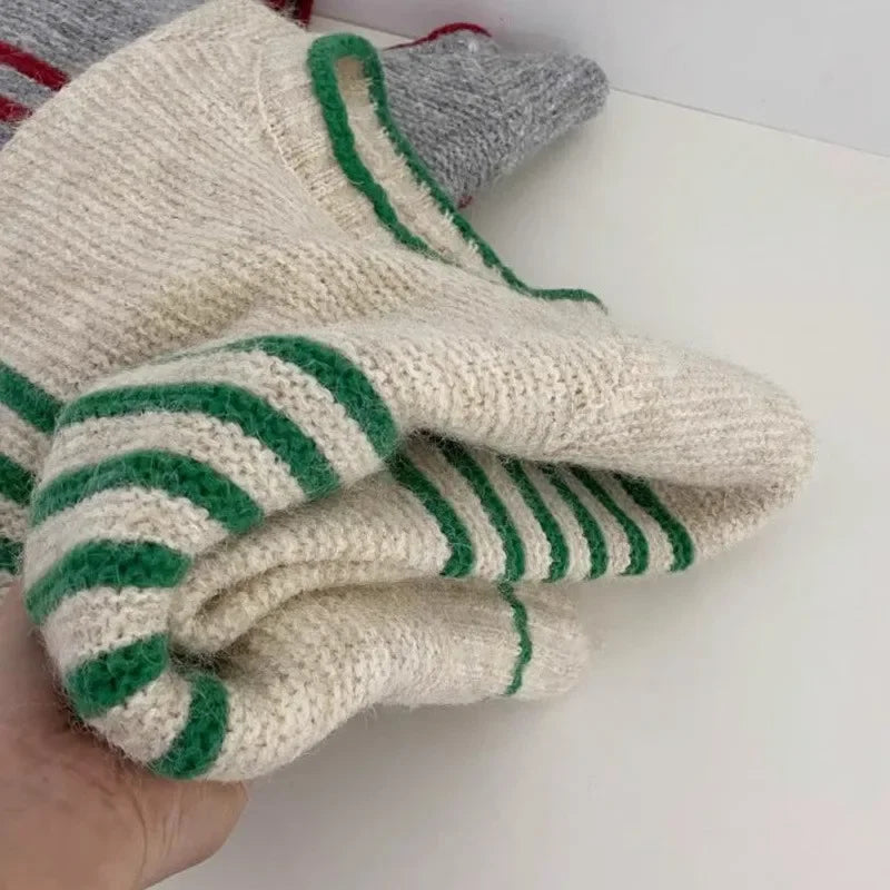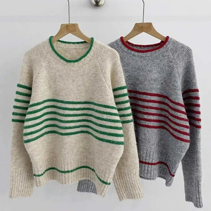 Women’s Retro Striped Knit Pullover – Casual Korean O-Neck Sweater