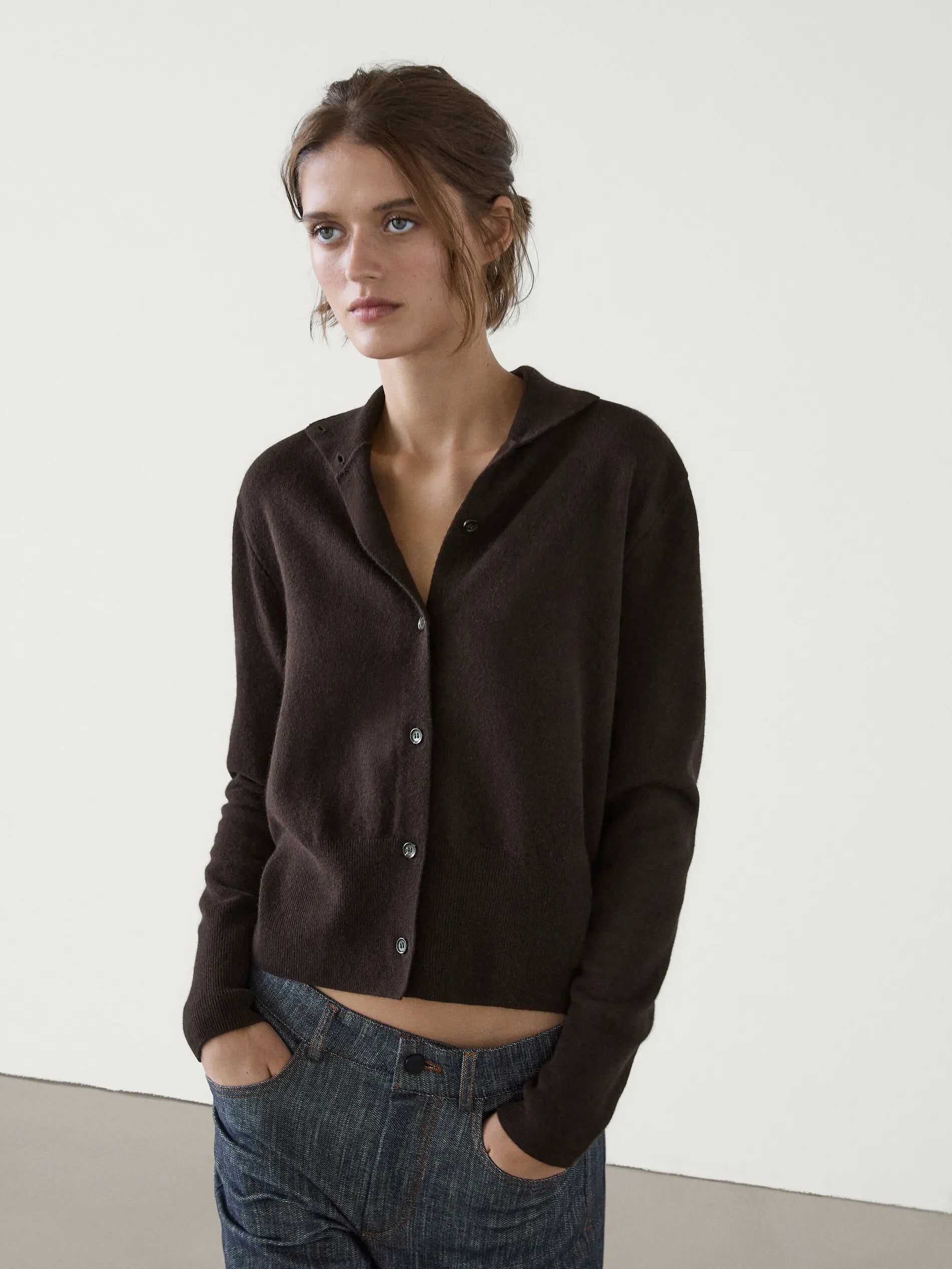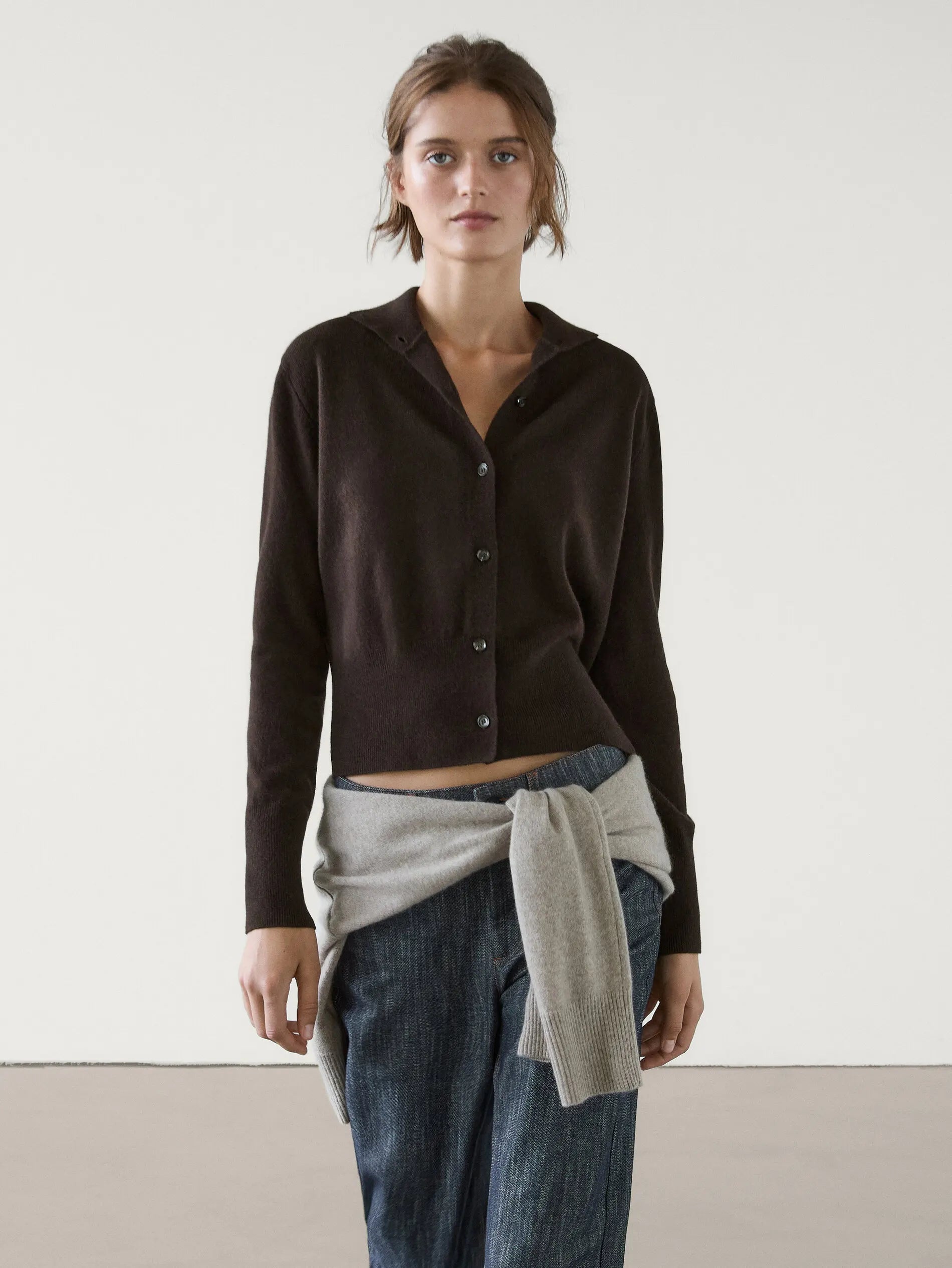 This women’s slouchy turtleneck cardigan from the Spring 2025 collection combines casual style with everyday comfort. Crafted from a polyester and nylon knit blend, it features a solid pattern, half-high collar, and single-breasted button closure for a chic, practical look.